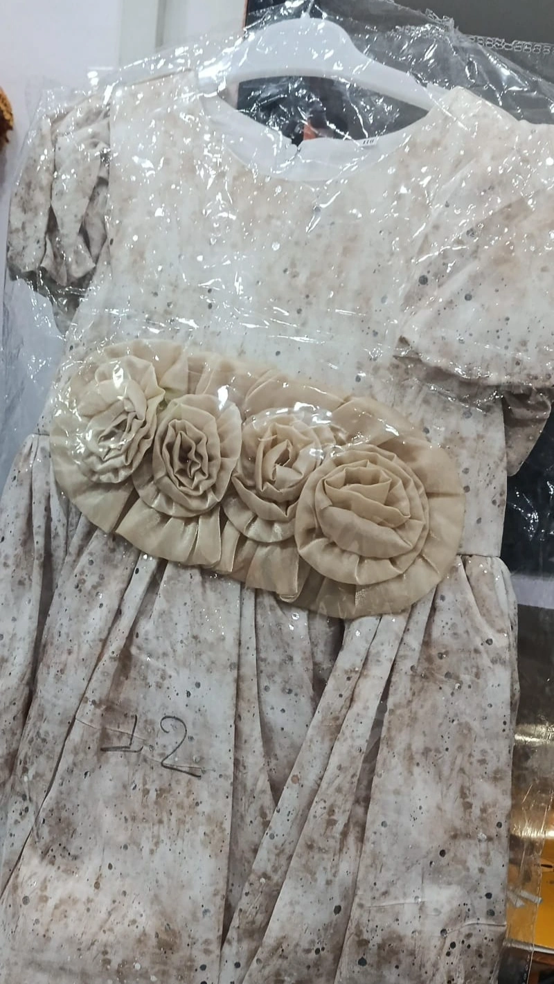 Elegant beige baby dress with soft fabric, puff sleeves, and beautiful rose waist design, perfect for parties, photoshoots, and special occasions.